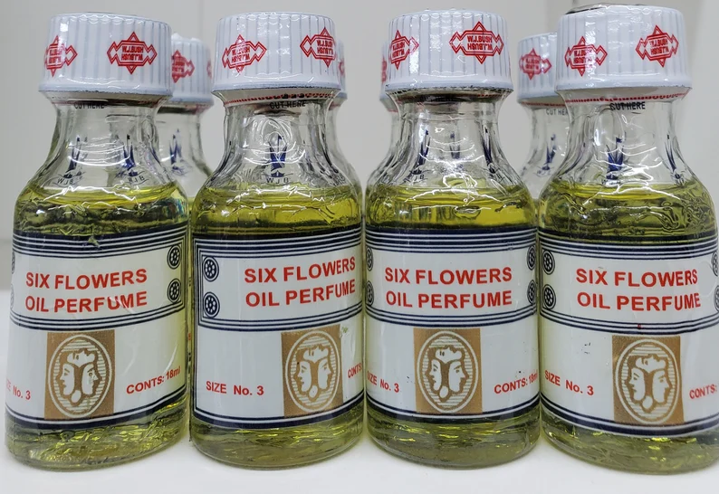 Six Flowers Perfume Oil is a popular, typically 18ml alcohol-free, and ammonia-free fragrance blend from Ghana, often used for daily wear and spiritual purposes. It combines floral essences—often rose, jasmine, lavender, lotus, magnolia, and marigold—to create a sweet scent aimed at attracting luck, love, and peace.